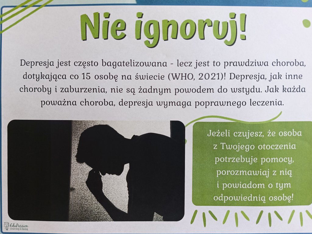 Zorganizowano szkolny dzień zdrowia psychicznego, w trakcie którego uczniowie mieli okazję wziąć udział w prezentacjach na godzinach wychowawczych z udziałem wychowawców klas na temat depresji oraz zdrowia psychicznego.