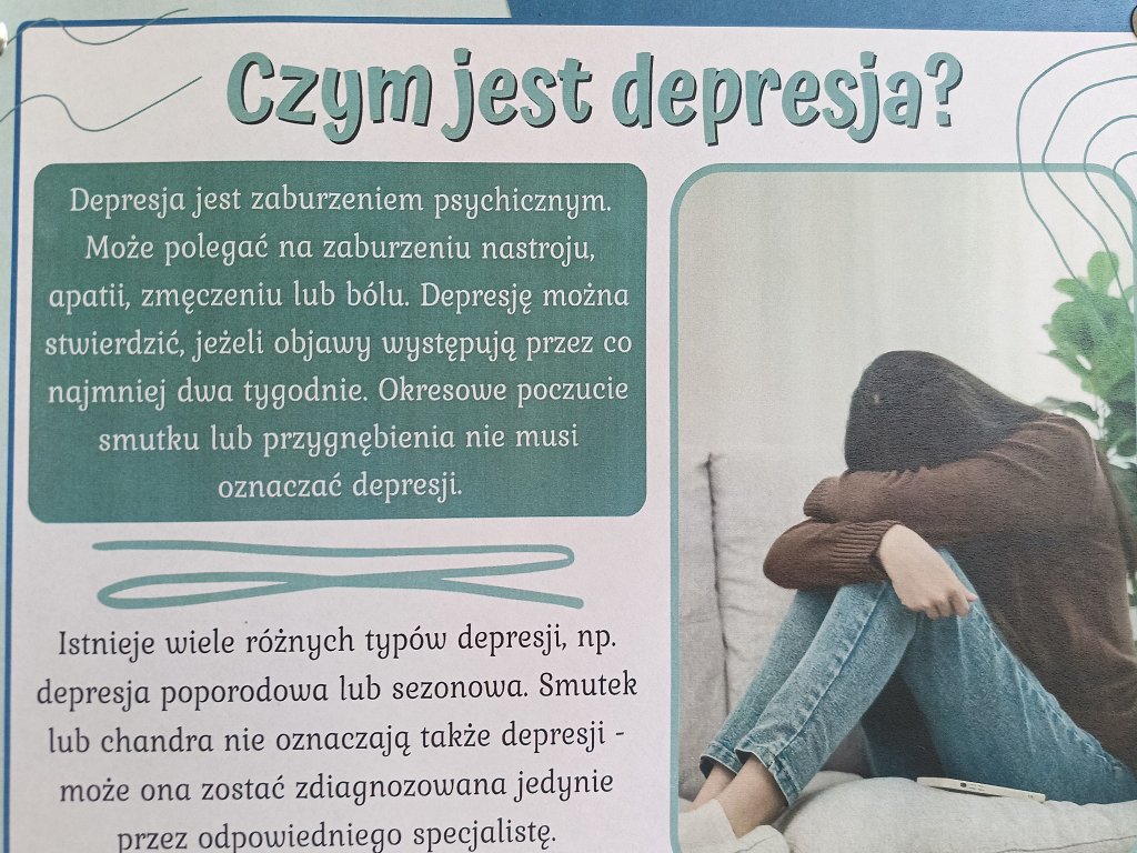 Przygotowano i rozprowadzono materiały edukacyjne, takie jak broszury, plakaty i ulotki, dotyczące objawów depresji, sposobów jej zapobiegania oraz możliwości szukania pomocy.