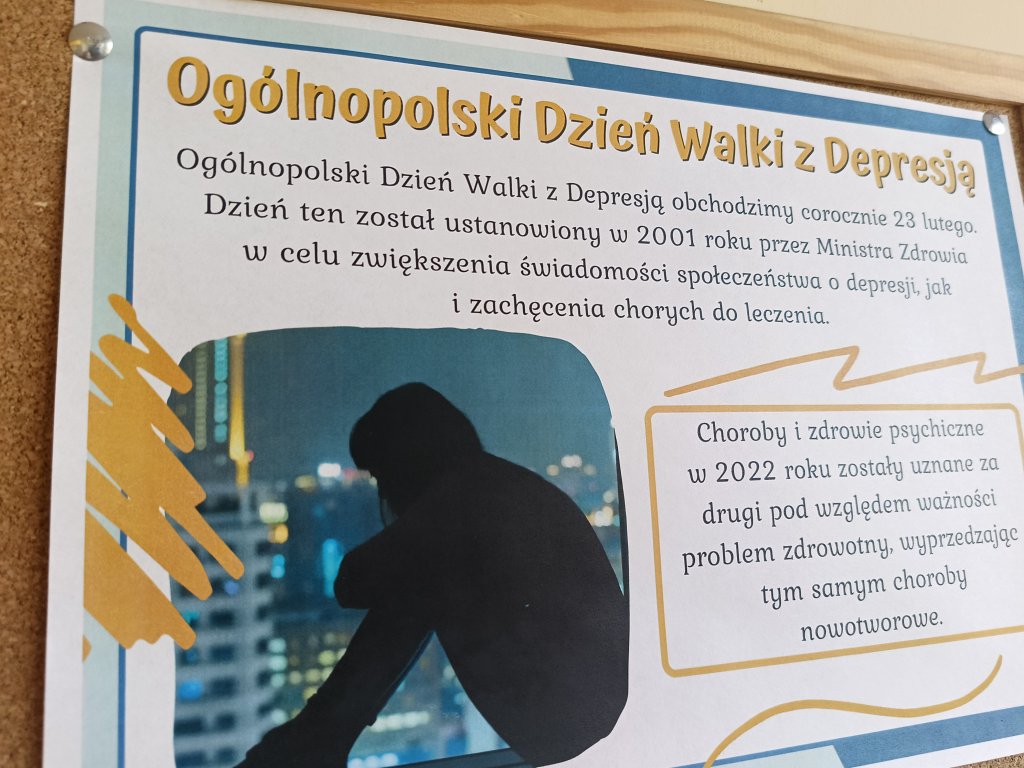 W dniu 23.02.2026 r. w Zespole Szkół Samochodowo-Usługowych w Skarżysku-Kamiennej obchodzono ,,Ogólnopolski Dzień Walki z Depresją”. Celem wydarzenia było zwiększenie świadomości uczniów, nauczycieli i rodziców na temat problemów związanych z depresją oraz promowanie wsparcia emocjonalnego wśród uczniów i dobrostanu psychicznego w środowisku szkolnym.