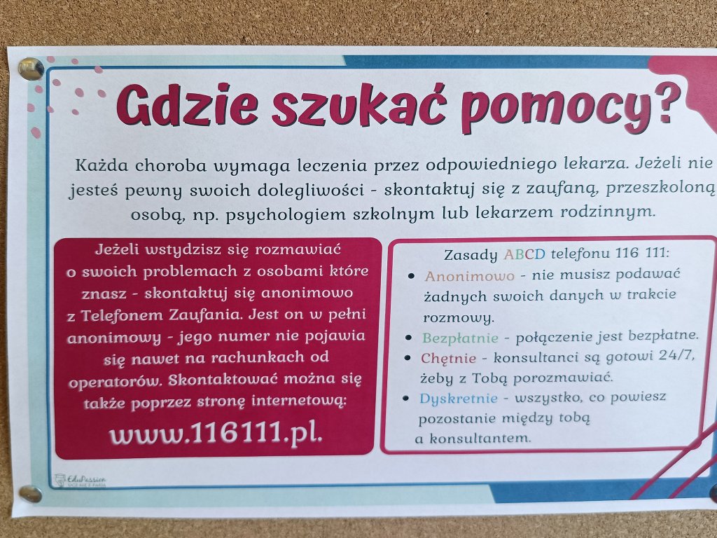 Rozpowszechniono informacje o dostępnych formach pomocy oraz numerach telefonów zaufania.